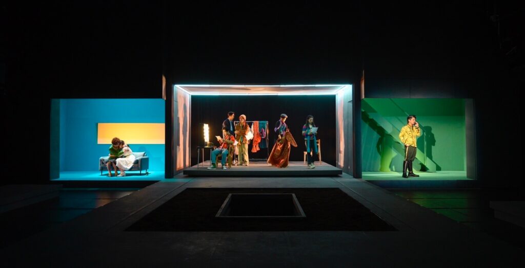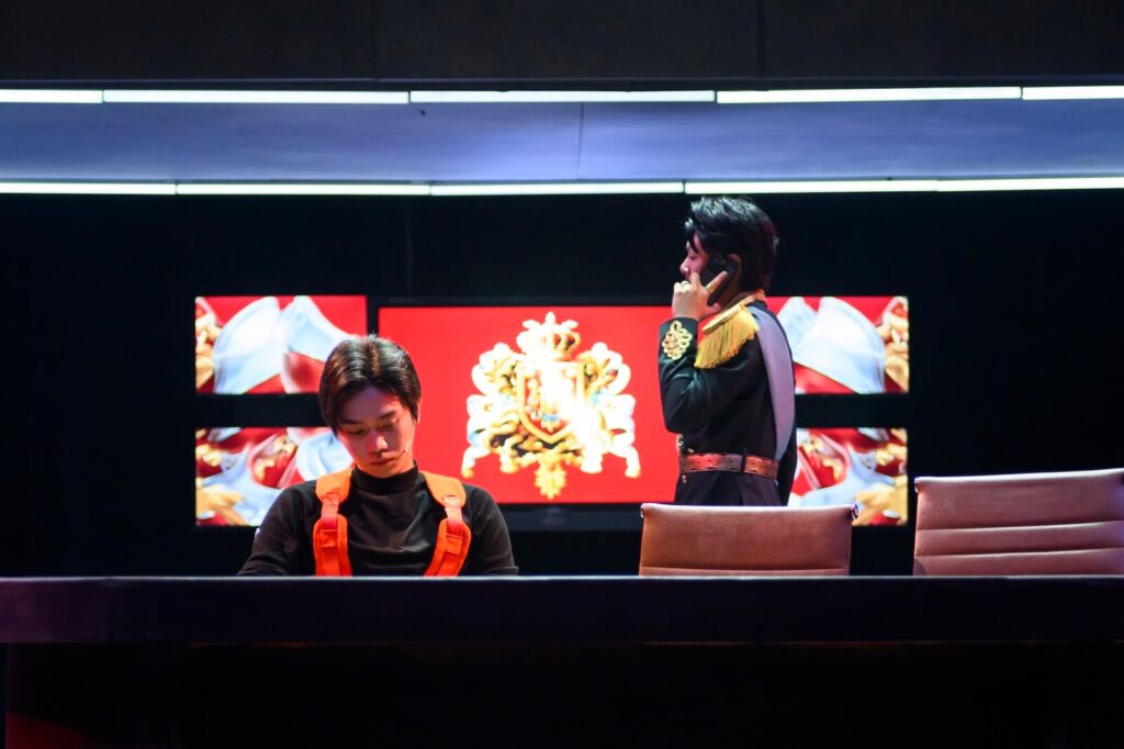 但與此同時,下半場一段透過政論節目形式呈現王國臣民八卦上位者的喜劇改編,幾位學生演員的拋接及對模仿人物形象的掌握都十分精準,不僅發揮推進劇情的功效,也引發現場觀眾極大的共鳴,展現出學生製作的生命力,個人覺得是此次演出中最大的亮點──也許主創團隊可以藉此重新思考選本及導演的策略。