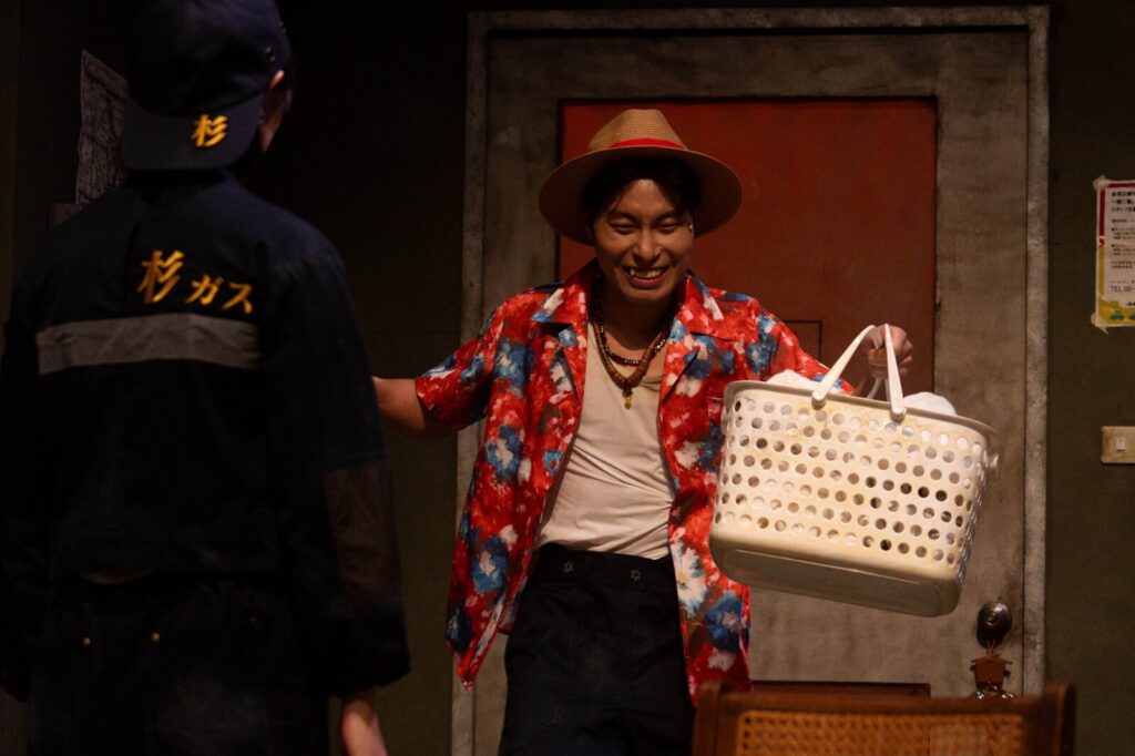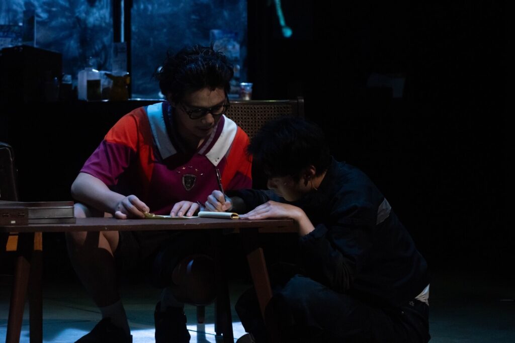 北藝大的演出清晰、有力,從舞臺設計到表演語言皆展現出對文本深刻的理解。北藝大的版本以高度克制的視覺語言構建了一個抽象的精神牢籠。日式加油站作為主場景的處理形式精簡卻功能強大。三扇落地玻璃門透進外界光線與雨雪,不僅具備劇場效果,也自然切換時空,強化角色內心的錯位與封閉。各個出口如二樓房間、廁所、廚房等都被大量且有效地運用於戲劇衝突,使舞臺不只是背景,而是角色心境的延伸,風扇時而停止時而轉動,牆上的日曆不斷墜落又被釘回,打火機的引線如血管般纏繞人體與傢俱……這些恰到好處的隱喻無需言語便呼應了「怎麼又回到這裡」的迴圈困境。午後的暖光與雨雪的冷光自然區隔時序與情感,以冷暖交替複現記憶的溫度差。換場時僅留風扇聲與雨滴聲,構建被拉長的心理時間;打火機哢嗒聲作為聽覺焦點,強化懸而未決的死亡預感。而廁所沖水聲的沈悶、二樓腳步聲的迴響和演員急促的尖叫等,使不可見的空間大量參與敘事,不斷牽扯著觀眾的視線和情緒。演員整體節奏穩定、表演質感成熟。弟弟的癲狂與脆弱在神經質的肢體語言中達成平衡,那不是一種病理學的標籤,而是長期壓抑的爆發;根森油膩的市儈氣中始終晃動著文人式的自厭,以及弟弟與護士情欲戲中顫抖的指尖與隱忍的喘息,均體現出對劇本「異常中合理性」的細膩把控,抓住了坂元裕二用日常碎屑掩埋創傷廢墟的特質。亦通過留白,為觀眾保留了咀嚼臺詞間隙情感震顫的餘地。