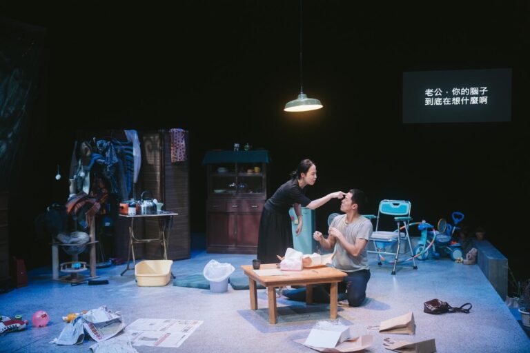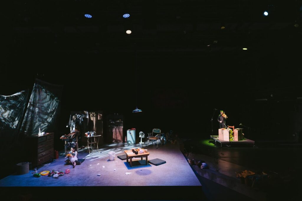 這是別役實的劇本首次轉譯成台語演出,除了基於台語聲調比華語更豐富,更接近日語的說話節奏,導演陳雅柔也期待台語與荒謬劇的結合能迸出不一樣的火花。此外、故事背景也從日本改為臺灣北部地區的頂樓加蓋——臺灣在地化的風景,運用熟悉的語言及場景,試圖讓觀眾更身歷其境。本劇另一特點是摒棄以往使用效果器、播放Program、預錄背景樂的表演方式,改讓音樂設計李世揚在舞台右側現場演奏小提琴、口風琴及敲擊樂。聚光燈在轉場時由舞台轉到右側的演奏者身上,填補轉場空檔之餘,也凸顯演奏者的存在,營造出演奏者與劇中台詞搏鬥的巧妙互動,令人聯想到七八〇年代風靡臺灣娛樂圈的「秀場」演出形式。