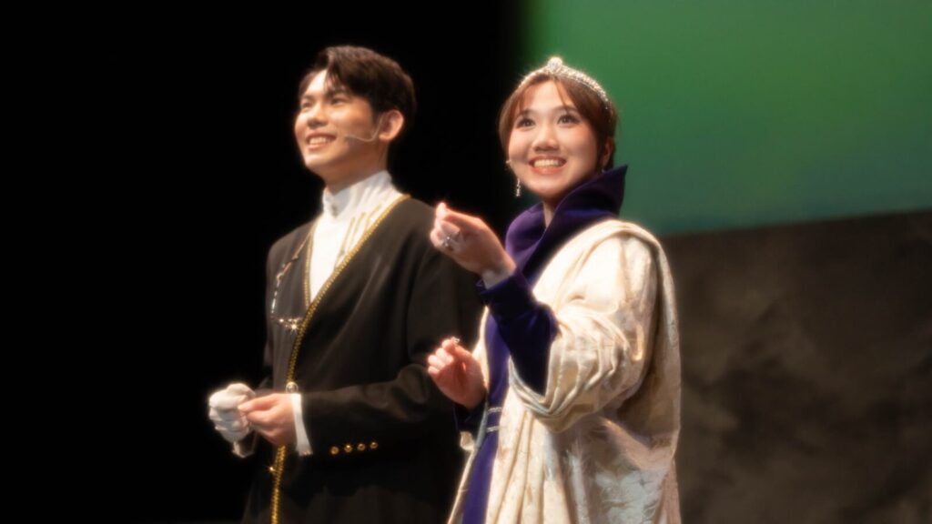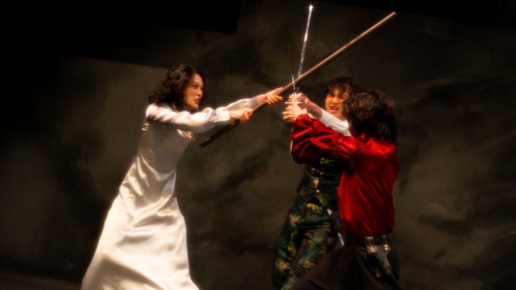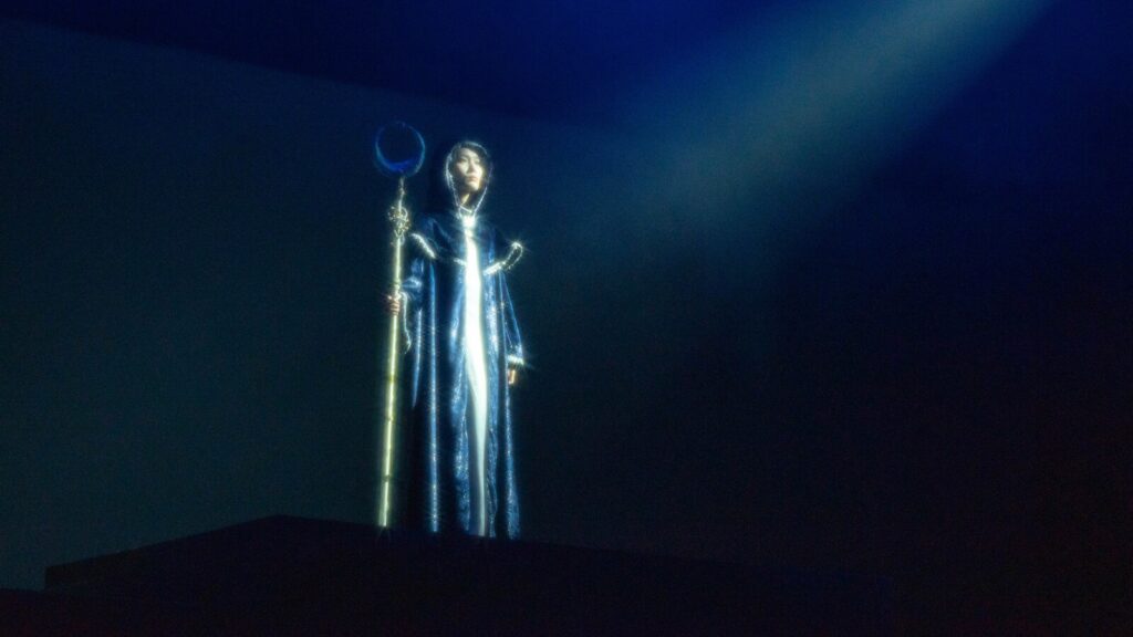 開場的暴風雨場景格外震撼──劇組巧妙運用發光雨傘、煙霧、藍光與舞蹈編排,生動呈現出暴風雨來襲時的驚濤駭浪。當普洛斯彼羅(Prospera)身披斗篷、手持魔杖登場,立時便攫獲全場觀眾的目光。特別是當她揮舞魔杖,令扮演白浪的舞者左右翻湧,乃至跌落地面時,更令人不由得心生敬畏,彷彿就連最宏偉的自然之力,也不得不屈服在這位神祕魔法師的掌控之下。