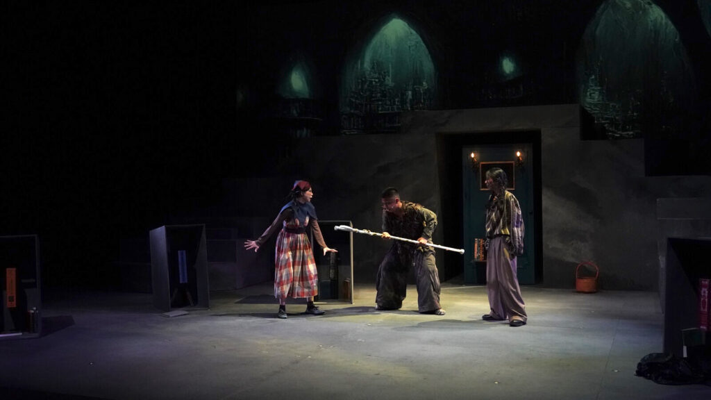 從這些細節,觀眾不難察覺:儘管普洛斯彼羅自詡過去是位隱士型君主,但在經歷背叛與流放後,她已蛻變為一位掌控慾強烈的統治者。如此強烈的對比開啟了另一種詮釋的可能:或許普羅斯彼羅真正需要的和解,並非與外在敵人的和解,更是與過去自己的調解。如今的她是個分裂的人:一面是過去那位溫和軟弱的學者,一面則是如今這名霸道強勢的君主。在暴風雨消散前,她必須在這兩個極端間尋找平衡,正如那不勒斯國王的顧問貢薩羅(Gonzalo)所言:「普洛斯彼羅在荒島上收復失土,而我們皆在迷失本性的時候尋回自我。」 此外,劇組也對劇本進行了改編,替女巫之子卡利班(Caliban)與那不勒斯國王阿隆索(Alonso)這兩條支線注入了新的能量。卡利班、特林鳩羅(Trinculo)與斯丹法諾(Stephano)不再只是負責插科打諢的丑角,而是在劇中建立起真正的革命情誼,意圖推翻他們眼中的暴政。我特別欣賞他們進入普洛斯彼羅的書房取得魔杖後,遭遇愛麗兒的襲擊,最後團結一致,共同抗敵。劇組巧妙地通過這種面對強大壓迫力量的反抗,挑起觀眾對這些次要角色的同情,讓我們認識到,卡利班也有自己嚮往的自由。