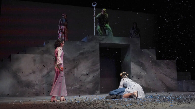 開場的暴風雨場景格外震撼──劇組巧妙運用發光雨傘、煙霧、藍光與舞蹈編排,生動呈現出暴風雨來襲時的驚濤駭浪。當普洛斯彼羅(Prospera)身披斗篷、手持魔杖登場,立時便攫獲全場觀眾的目光。特別是當她揮舞魔杖,令扮演白浪的舞者左右翻湧,乃至跌落地面時,更令人不由得心生敬畏,彷彿就連最宏偉的自然之力,也不得不屈服在這位神祕魔法師的掌控之下。
