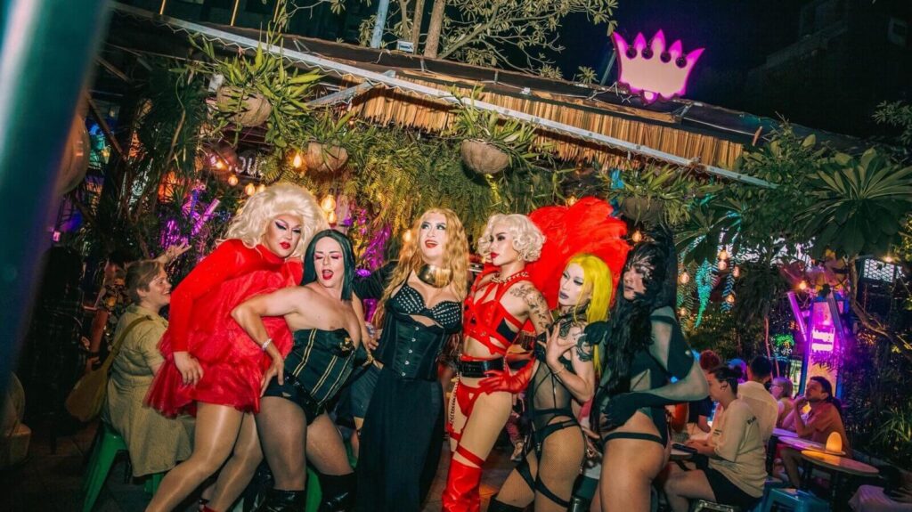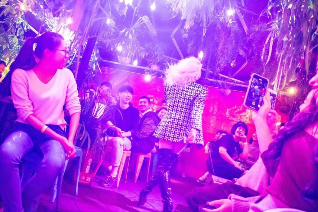不同的表演場地也會有相應的互動模式,例如有些較為開放的環境就在地形上允許皇后深入每個角落,和遠處的觀眾做進一步的互動,而這也成為像Café Dalida這樣的小酒吧的優勢——讓看秀不只是一個被動接收的狀態,而是由雙方共同完成的演出。有趣的是,在現場的戲劇張力牽引之下,經常能看到觀眾也跟著「愛演」起來,創造出相當活潑生動、全場同樂的畫面。