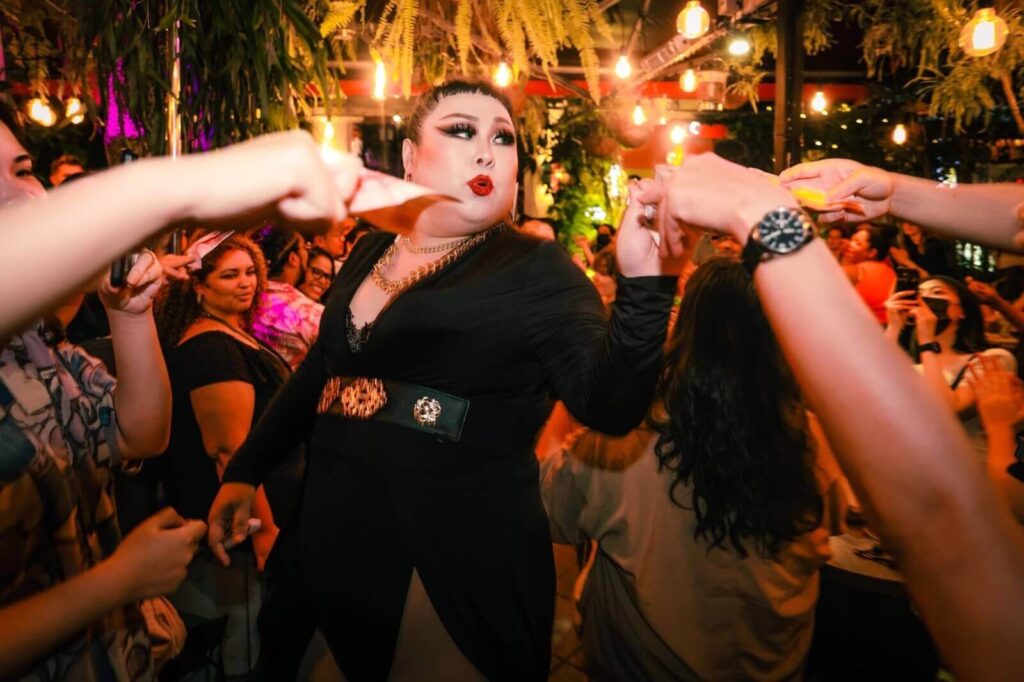 而當想到變裝皇后,另一個熟悉的風景就是皇后對著外表姣好的男客人又摸又抱、盡情調戲,當事人手足無措的尷尬反應對比著同桌朋友興奮的起哄,組成秀場上一貫的經典搭配;雖是老戲碼了,但總能帶起全場氣氛。3與觀眾的互動是drag show表演中重要的一環,除了前面提到的「調戲式」,還有朝台下丟糖果、如「蕉佛」妮妃雅4現場分送香蕉的「小禮物式」;又或是頂著一身女性裝束與婀娜姿態,卻發出強而有力的低吼,在沒有歌詞的段落故意用男性原聲向觀眾要求歡呼的「男叫式」;也有在拿小費的過程加戲的「謝打賞式」,這類型的互動會針對給小費的觀眾特別服務,像是示意觀眾直接將鈔票塞入乳溝,或是故意用嘴接過鈔票等等。