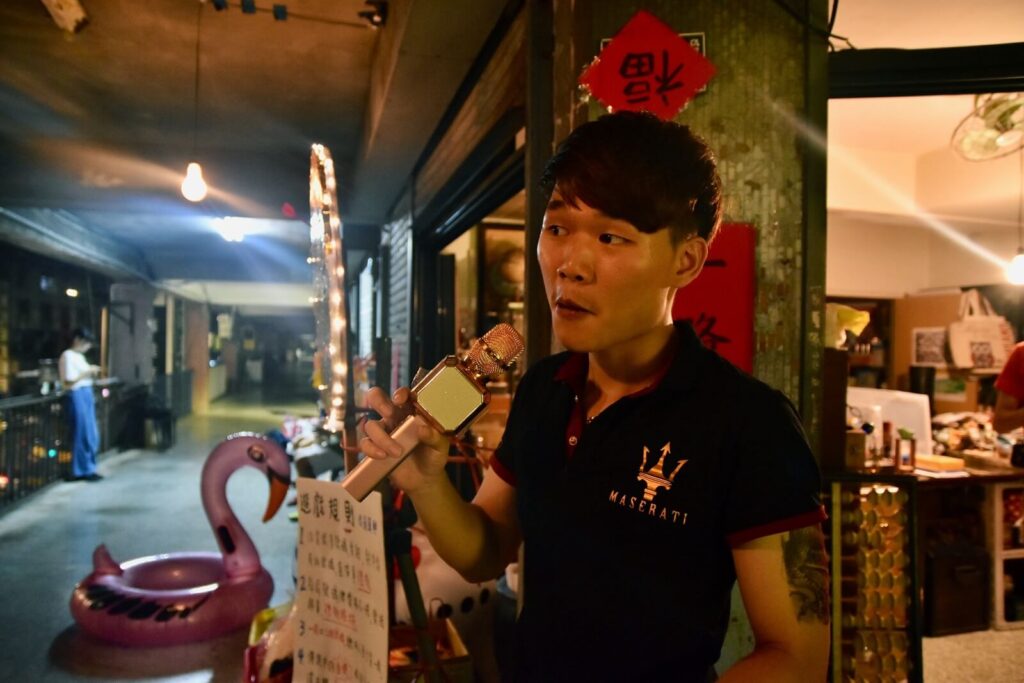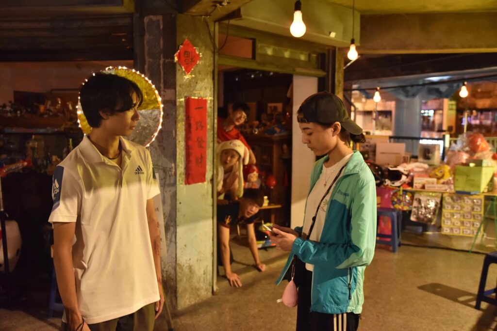 其一:由於這個表演空間實際上是當地居民經常經過的通道,因此如何在不妨礙演出的情況下與當地居民共處,便成為製作期間我們經常討論及考量的問題。首先,一個設定在夜市的故事,提供了一般民眾和表演空間「借道」的可能性,因此在前期的文本工作期,導演和演員、編劇相互討論,將其中一名角色的靈活度調高,讓他能夠更即時地根據現場情況進行互動。此外,也採用了區分開放互動和親密戲碼的策略,以控制人流經過表演空間的時機,類似於「觀眾遲進點」的設計。這不僅有助於保持戲劇節奏的掌握,還有助於緩和當地居民對演出的觀感,使整體演出更加順利而具有互動性。