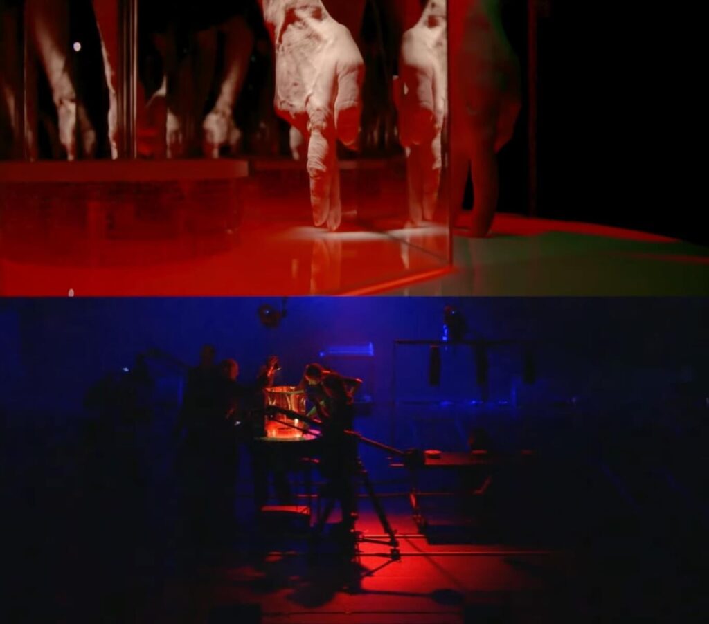 還有一齣戲叫做《指尖上的幸福人生》(Cold Blood),巧妙地利用了現場即時攝影的技術,拍攝演員的手在舞臺上的微型場景之中表演。其實整齣戲就是一個拍電影的過程——觀眾可以直接看到技術人員是如何在舞臺上運鏡,同時也能欣賞完成的投影影像效果,了解到這之間的「魔法」是如何產生的。這種視角非常有趣。我覺得這也是另一個同時兼具科技感與手工感的作品案例。