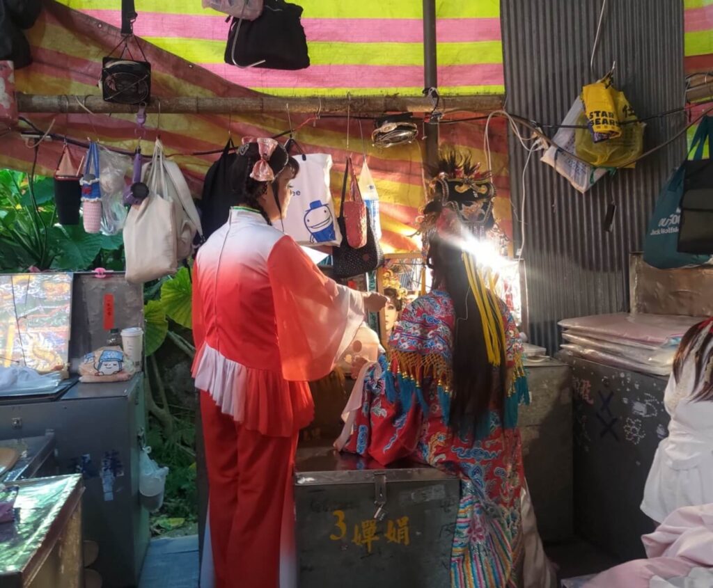 我總覺得民戲演員是空間管理大師,能夠將所有空間運用到淋漓盡致:寸土寸金的雙北地區,往往因為廟口腹地不大因此戲臺狹小。又甚至必須搭建在車來車往的馬路上,小小的戲棚不僅是演員演戲的舞臺,更是演員需要棲身一整天的所在。接在起籠後面的便是更換套衫套褲開始化妝,劇團中的老師及前輩們總能將自己的位置安排地有條有理,明明狹窄卻能靈活運用,將屬於自己的位置布置得舒適、方便演出,而我總對於他們的魔術大空間讚嘆不已。