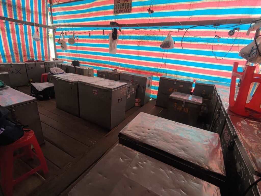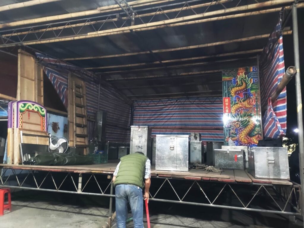 除了收拾自己的東西之外,我們還有一個重要的任務:幫忙收臺。每一次演出前都需要搭臺,也就是落籠、綁布景、牽電線等,將一個戲臺從空蕩蕩布置成可以演出的狀態。而到了演出結束、準備過位8時便需要收臺,將固定在戲臺骨架上的音響設備、電燈裝置以及布景、橫批卸下,再將地毯和布景折好,折布景和折戲服一樣也需要相當的技巧,布景面積大,所以通常需要兩到三個人合作才能完成,將所有東西都折疊、分解完成後再一一收回相對應的籠中,把戲臺從演出時五光十色的絢爛模樣,再恢復成木板竹竿的空臺。有時候籠車比較早來,我們便能看著所有東西被拖上卡車,目送籠車載著戲籠及硬景去到下一個戲臺。