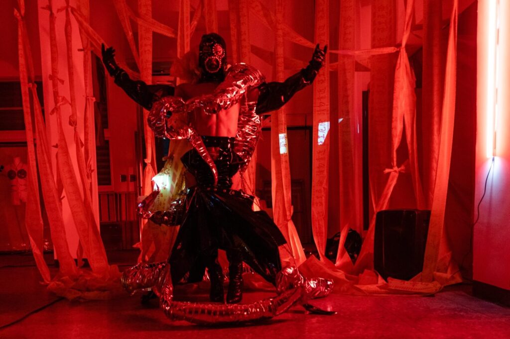 「太巧了!」我不禁讚嘆,當以磬談到第一次變裝是在2019年的台北藝術自由日1,才發現原來我們早就見過彼此,當時他便以Ophelia為名,參與深夜放電所的作品《我愛你一分鐘》。當初以Ophelia作為Drag Name的契機是魏如萱的歌〈Ophelia〉剛發行,加上Ophelia在莎士比亞悲劇作品《哈姆雷特》裡深陷愛情的形象,讓自稱戀愛腦與性格較為憂鬱的他,決定從自身的成長經驗中挖掘故事,以此經營自己的變裝角色。Ophelia瘋癲的形象也剛好與他後來的變裝皇后家族「瘋家」(The House of Wind)的風格契合,種種原因集合形塑出以磬心中Ophelia的樣貌。
