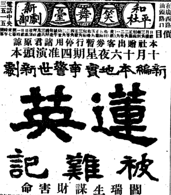 1920年9月,也就是距離6月案發約三個月後,大世界乾坤大劇場便搶先懸出了《蓮英刦》水牌,吸引不少觀眾。10然而當局以「案未終結,未便啟演」為由,禁止了這一次的演出。1111月23日,閻瑞生與吳春芳伏法,經過幾個月的等待,上海各大劇院早已摩拳擦掌,蓄勢待發。11月25日,也就是閻、吳被槍決的兩天後,大世界乾坤大劇場和笑舞臺和平新劇部在同一日推出了京劇《蓮英刦》和新劇《蓮英被難記》。從1920到1921年,上海就有大世界乾坤大劇場、笑舞臺、大舞臺、共舞臺、新舞臺,總共五個劇院將「閻瑞生案」搬上舞臺。12